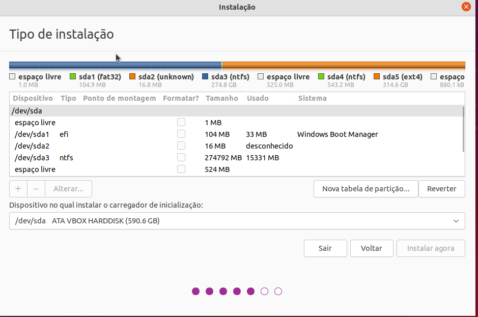 Independente da distribuição que vá instalar a partição efi do Windows será reconhecida, no caso do Ubuntu após criar as partições em "Dispositivo no qual instalar o carregador de inicialização" deixe o detectado automaticamente, nesse caso /dev/sda.